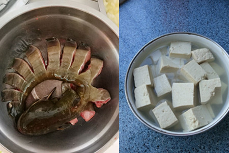 首先,我们需要将鲶鱼的腹部切开,然后去除它的内脏。在这里需要注意的是,因为鲶鱼的鱼籽是绿颜色的,因此当我们见到它的鱼籽时,一定不要吃惊,不要以为这条鱼是有毒的。接着,我们需要将它用清水清洗干净,同时在上面撒上一些盐腌制一段时间。然后,我们还需要将豆腐切成块状备用。