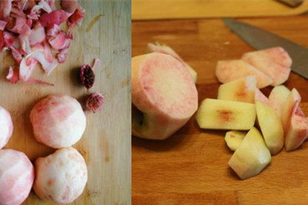 1、先将水蜜桃削去表皮,切成小块。这样比较容易煮烂,选用的水蜜桃可以尽量选比较熟的,这样比较多汁。