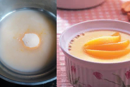 3、在煮锅中重新倒入适量的水,水煮开后,把布丁粉放入其中,用勺子轻轻地搅拌均匀。在布丁模具中,加入几块水蜜桃,倒入些许的布丁液。待放凉后,把它放入冰箱中冷藏几个钟头就可以食用了。