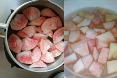 1、将水蜜桃削皮,切成大小适当的块状。往煮锅中倒入适量的水,水开沸腾后,把水蜜桃块和冰糖一齐倒入锅中。煮上十分钟左右,如果喜欢吃比较软的水蜜桃,那么可以适当地延长煮的时间。