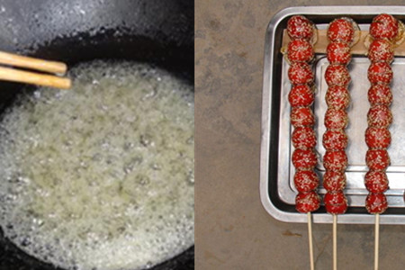 首先,我们需要用大火将它熬煮一段时间,待它的表面出现气泡的时候,我们需要将它调成小火。与此同时,我们还要用手不停的来回晃动锅底,这样可以使它受热更加均匀。接下来,我们需要将事先准备好的山楂放入糖浆中翻滚一圈,然后再将它放到菜板上,同时再撒上白芝麻。【女物原创未经允许,谢绝转载!】