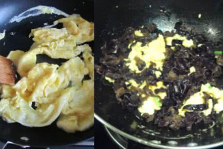 4、利用锅中的余油,把豆瓣酱放入锅中进行翻炒。翻炒片刻后,把准备好的木耳一齐倒入锅中,煸炒直至木耳熟。再把之前炒好的鸡蛋块放入其中,与木耳一齐翻炒。由于豆瓣酱本身是有咸味的,所以不需要放盐。炒熟就可以装盘食用了,如果吃起来不够味,可以适量地加些调味品。