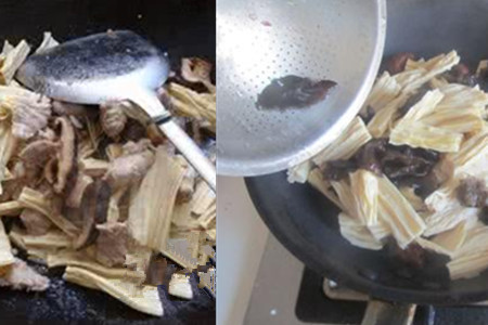 6、在炒锅中下入些许的植物油,油温加热后,下入生姜丝、葱花进行翻炒爆香。待香味散发后,快速下入腌制好的肉片大火翻炒。待瘦肉变色后,往锅中加入腐竹进行翻炒。翻炒片刻后,就可以下入木耳和芹菜,加入盐和鸡精进行调味。可以加入些水淀粉,汤汁浓稠就可以关火食用了。