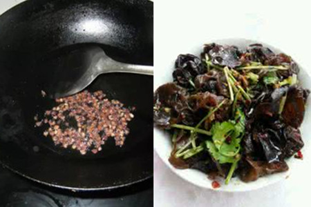 5、在炒锅中倒入一些油,油温加热后。放入花椒进行翻炒爆香,但是花椒不能炒太久不能会有苦味。香味散发后,把热油同花椒倒入之间制作好的酱汁中。