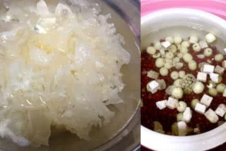 2、先将莲子、鸡头米、茯苓放入清水之中浸泡片刻,再捞出放在水龙头下清洗干净。把松茸、银耳事先放在水中进行泡发,放在一旁备用。把泡发好的银耳,用手撕成小块状。