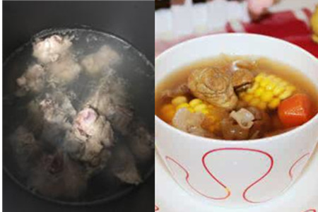 3、把买回来的新鲜的瘦肉洗净表面的血水,用刀切成几大块。在煮锅中倒入些许的水,把生姜片放入其中,再加入瘦肉焯一遍水。这样能很好地去除瘦肉的腥味,使其口感更佳。把甜玉米剥皮去须,用刀剁成长短适当的段状。胡萝卜削皮,切成滚刀块。