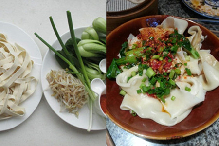 第四,将面条下到锅里煮熟后,捞起放到盛有菜码的碗里,浇上生抽、醋,再添些葱末和蒜末,洒上辣椒粉,而后淋上热腾腾的油即可。【女物原创未经允许,谢绝转载!】