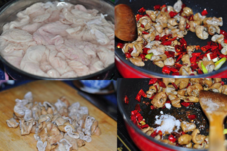 做法步骤:1、从市场买回的整副的猪大肠冲洗几次,切为小长段,逐段翻出内面。加入适量的盐、淀粉搅拌,轻柔搓一下,把里面看得见的脏东西都撕掉,太多的脂肪也撕去一些。记得别撕完了,没有脂肪就不叫肥肠了。用水反复清洗,洗得肥肠白白净净为止。