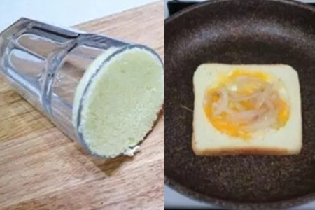 然后介绍第二款三明治,这款三明治适合家里没有烤箱的你。需要准备的食材有:吐司、鸡蛋、火腿、芝士片、洋葱等。将火腿和洋葱切好,以备不时之需。先取一块吐司片,找一个大口的玻璃杯,把杯口对着吐司片中间压下去,将面包中间掏空。接着往平底锅中倒入少量油,放入先前掏空的面包片,在中间打上一个鸡蛋以及放入切好的洋葱丝,将其平铺放好。