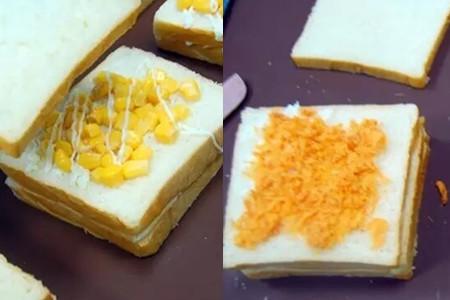 接着将吐司片分组放好,以四片为一组。先将第一片吐司片平铺好,涂上适量的沙拉酱后夹上一片火腿片,盖上第二层吐司片,把玉米粒平铺上去并涂上少许的沙拉酱;接着把第三层吐司片,夹上肉松并挤上一层沙拉酱盖上第四片吐司片,将吐司边切除即可。去边后,在三明治周围沾上蛋黄液。将其放入烤箱调制快热档190度,大约烤上7分钟即可。