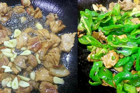 锅里加入适量的油,等油烧热了之后,将肥肉放进去煸炒出油来。接着再将腌制好的瘦肉放进锅里翻炒均匀,等瘦肉变色了之后,即可盛出来备用。锅里再留一点油,油烧热了之后放入辣椒进行翻炒,等辣椒炒到五六分熟的时候,再将猪肉放进锅里一起翻炒均匀。翻炒均匀之后加入鸡精,盐调味即可食用。【女物原创未经允许,谢绝转载!】