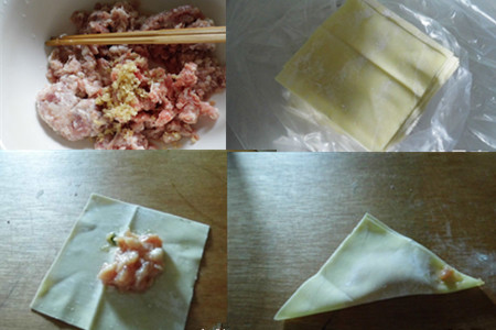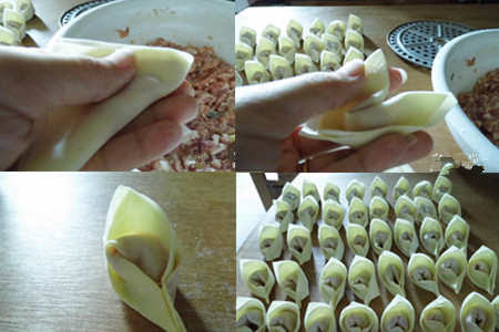 第二步,包抄手。将鸡蛋打在猪肉馅中,加入适量的姜蒜末、生抽后,用筷子用来搅拌均匀(注意一般一个方向搅拌为好)。取一张抄手皮,放上适量的猪肉馅,对折成出一个三角形后,在三角形的每个角上抹上点猪肉馅油,再将左右两个角对折,受轻轻捏一捏做成一个小元宝就可以了。包好的抄手放在盘中里面,向一个一个小元宝,非常可爱。