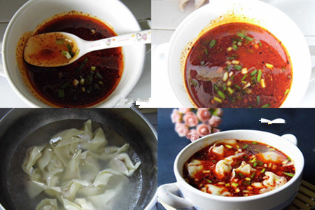 第四步,煮抄手。在煮锅中将水(如果家里面有熬好的骨头汤,用骨头汤更好)烧开后,将做好的抄手下进去,等到抄手浮于水面后再煮上一分钟左右就可以捞起来倒入碗中。在碗中加入适量的汤,将第三步调制好的辣椒油加点进去,搅拌均匀就可以动筷子了。【女物原创未经允许,谢绝转载!】