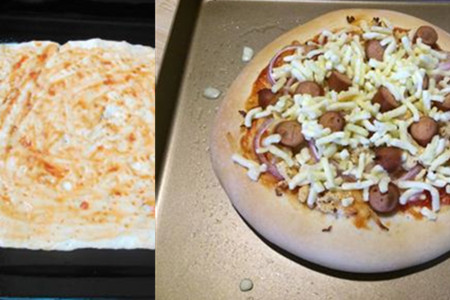 6、把发酵好的面团取出,用手再揉搓片刻。在烤盘上用小刷子刷上一层薄薄的油,用手将准备好的面团摊薄在烤盘上,均匀地刷上些番茄酱。再在上面,一次铺上芝士片、鸡肉、洋葱,淋些橄榄油。