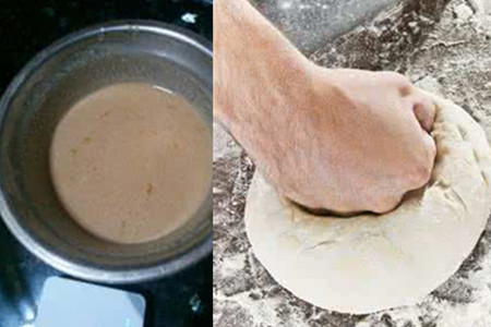 2、在酵母中加入适量的温水,进行充分地搅拌。再往其中加入面粉、盐、白砂糖,用筷子顺着一个方向搅拌成絮状。