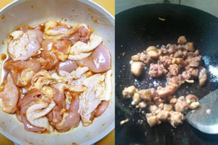 5、在炒锅之中倒入适当的油,油温烧热片刻后。把鸡肉倒入大火进行翻炒,炒制鸡肉开始变得金黄色,就可以铲出待用。利用锅中的余油,下入洋葱丝进行翻炒,炒至表面焦黄,同样铲出待用。