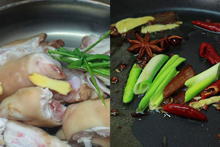 猪蹄洗干净,去掉杂毛,斩成小块。锅内加适量冷水,放入猪蹄,加几片姜片、葱结和料酒,大火煮开。煮开后,把浮沫去掉,捞出锅滤干水分。锅里倒适量油,放入八角、干辣椒、小茴香、桂皮、葱段和姜片爆香,倒入滤干水分的猪蹄,翻炒片刻。