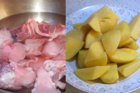 猪蹄洗干净,去掉表面的杂毛,剁成小块,冷水下锅,大火烧开,煮五分钟,捞出锅用清水冲洗干净。土豆削皮,洗干净切成块。