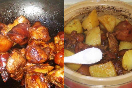 一个半小时后,打开盖子,放入土豆块,再盖上盖子煮十分钟。十分钟后,开盖,加适量食盐,继续炖煮至土豆完全熟透。土豆炖熟之后,加一些鸡精,再撒些葱花即可。要等土豆快要煮熟的时候才加盐。土豆尽量切大块,不然容易碎掉。
