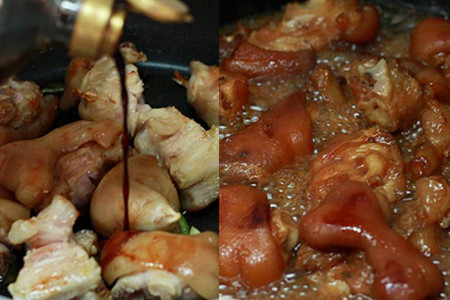 等到猪蹄表皮变黄的时候,加入适量料酒,老抽和盐,再加两块冰糖,翻炒一会,倒入清水,水量需要没过猪蹄。转大火煮开,转小火炖一个半小时。一个半小时后,猪蹄已经炖得十分软烂了,这时候转大火把锅里的汤汁收到自己喜欢的程度,这道猪蹄就做好了。