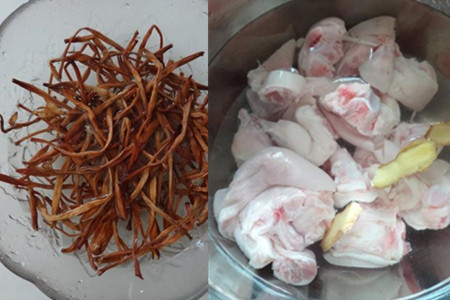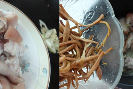把干金针菜提前用水泡发。猪蹄去掉表面的杂毛,清洗干净,斩成小块。生姜洗干净切成片。把猪蹄和生姜片放入锅里,加清水没过猪蹄,开大火煮沸,加适量料酒,去掉猪蹄的血沫。捞出猪蹄,用流动的清水冲洗干净,控干水分待用。把泡好的金针菜也控干水分。