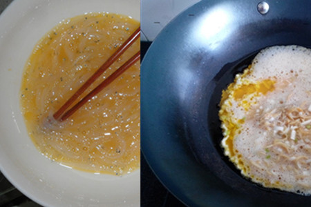 第三步,加入准备好的银鱼以及少量的食盐和料酒继续搅拌。注意银鱼在清洗的时候不要太用力,以免出现损坏。