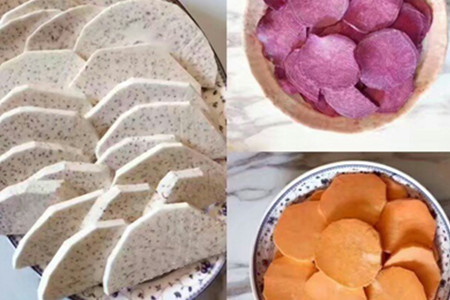 接下来就是制作芋圆了。首先我们将紫薯、南瓜、芋头都洗干净去掉皮,然后切成薄薄的片放入蒸锅里蒸。蒸的时候要把它们分开,不然的话很容易混色的。蒸熟了之后,接下来就把它们分别用工具弄成泥。弄成泥之后将它们分别都添加木薯粉、白砂糖搅拌均匀,搅拌均匀之后用手揉的更加均匀一些。然后将它们分别搓成小长条,用刀再切成小面团。