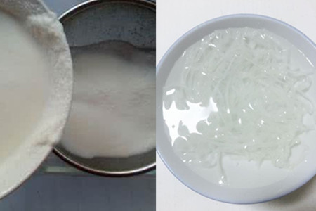 3、把琼脂事先泡在水里,一直到泡软为止。如果家里没有琼脂,也可以使用鱼胶粉或者吉利片替代。把牛奶倒入杏仁汁之中,加入适量的白砂糖进行充分地溶解搅拌,使白砂糖完全融化在其中。
