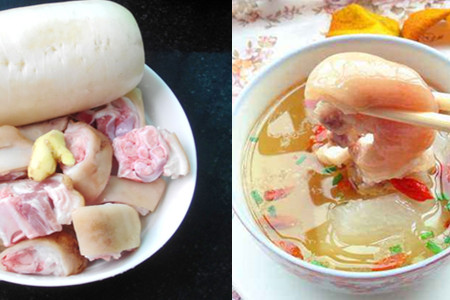 第二,取一只干净的锅,下猪蹄、白萝卜块和姜片,大火烧开后转至小火慢慢炖上2h,待到将起锅时调入适量盐调味即可。