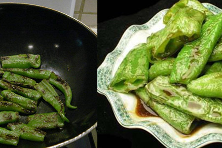 等到尖椒的两面都已经煎至褐色,并且表皮已经另起了一层酥皮,这就表明尖椒已经煎好了。然后调小油锅的温度,将事先已经调制好的作料,缓慢地倒入锅内。然后用文火将汤汁烧开,在这一过程中,汤汁中的香味儿慢慢地渗透到尖椒内,等待尖椒变的柔软了就可以拿出来了。