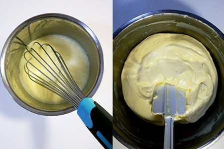 4、将淡奶油用打蛋器打到丝滑状态,将其和吉利丁片一起放入鸡蛋糊中。