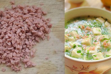 准备好白豆腐、青菜、火腿、淀粉。白豆腐切成小块状、青菜和火腿切成碎末放在一边备用。先将白豆腐放入锅中焯熟一下再捞出来。