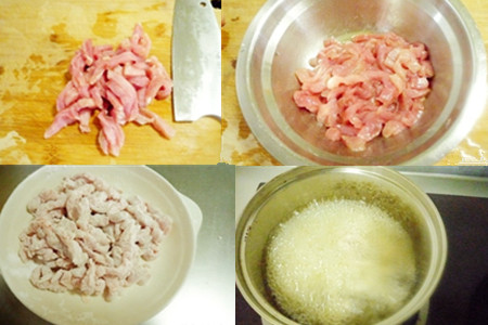 第二步,处理食材。将猪肉里脊肉切成小细条,放适量的食盐、胡椒粉、姜蒜末、蛋清和适量的淀粉搅和均匀,让全部肉丝都沾上淀粉,而且互相不粘连在一起。一般而言,里脊肉要腌制十五分钟左右。土豆切成条,加入适量的盐、蛋清和淀粉搅和均匀。