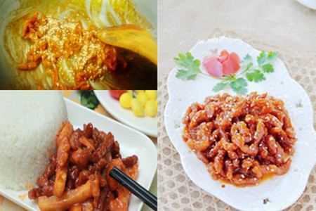 第四步,炒糖醋里脊。用锅中剩下的底油,倒入适量的番茄酱、白砂糖和醋,翻炒至白砂糖融化。然后倒入适量的淀粉水熬成浓稠的汤汁后,将炸好的里脊肉和土豆条倒进去翻炒均匀,五分钟后撒上白芝麻就可以舀在白米饭上就可以了。【女物原创未经允许,谢绝转载!】