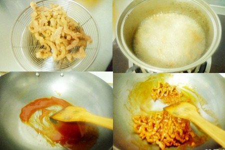 第三步,炸里脊肉肉丝和土豆。炸里脊肉和土豆是技术活,不能将肉炸老了,也不能把土豆炸碎了,一定要刚刚好。在炒锅中热油至八分熟,然后将里脊肉抖一抖后放进油锅炸到表面微微带黄捞起来沥一会儿。再放进油锅炸一遍后沥起来。然后把土豆条炸熟。