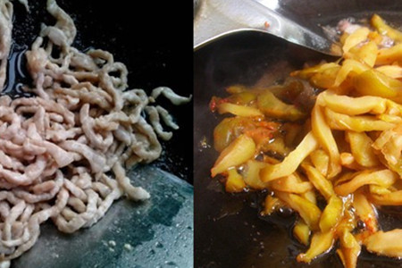 榨菜焯的时间不能太长了,如果太长就会失去它的口感。榨菜焯好了之后沥干水分放在一边备用,里脊肉洗净之后切成肉丝,然后用料酒、油、淀粉、盐搅拌均匀腌制十分钟左右备用。葱切成三到四厘米的段备用,蒜切成末备用,红辣椒洗净去掉籽后切成丝备用,生姜切成姜丝备用。所有的原材料都准备好之后,接下来就要开始炒了。