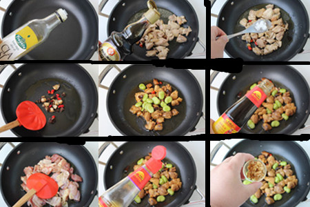 第三步,红烧蚕豆鸭肉。开大火,在炒锅中将植物油热到八分熟,将姜蒜末和朝天椒碎末及香菇丁倒进去爆炒,再将鸭肉块倒入翻炒至鸭肉表面变成金黄色。然后加入适量食盐、生抽、白糖,将煮好的蚕豆倒进去一起翻炒三分钟,加入适量料酒和清水,盖上锅盖煮上十五分钟。等到汤汁收掉四分之三后,打开锅盖翻炒均匀就可以出锅了。