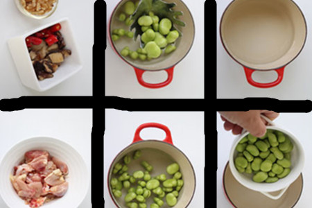 第二步,处理食材。将鸭腿肉洗干净后将骨头去掉,切成小块状。将切好的鸭腿肉放在碗中,加入适量的生抽和料酒腌制十分钟左右。蚕豆洗干净后放进开水锅中煮上五分钟左右以便于去除腥味,捞起来沥干后放进冰水中过一下以备后用。香菇洗干净后切成小丁状,朝天椒合姜蒜都切碎。
