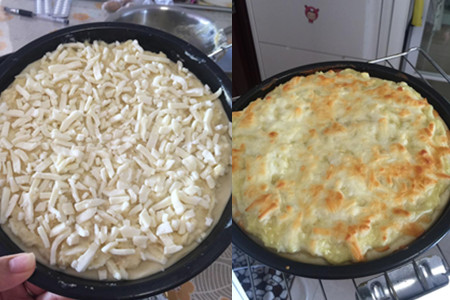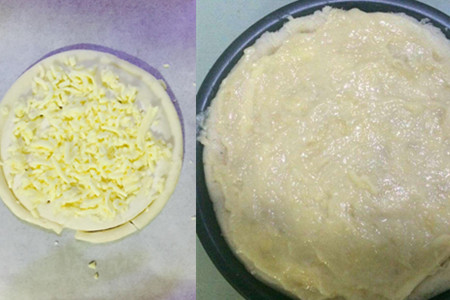 接下来,我们需要准备两块榴莲果肉,然后我们可以用叉子或勺子将它压成泥或者是选用搅拌机来将它制作成果泥。除此之外,我们还需要准备一些马苏里拉奶酪,然后用刀将它切成碎块。接着,我们需要将一层奶酪铺在饼上面,同时再将我们事先准备好的榴莲泥铺在上面,然后我们还要在上面铺一层奶酪,这样便可以了。