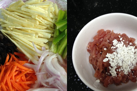 我们首先,将这些原料切成丝备用,里脊肉也应该切细一点,这样可以保证鲜嫩的口感。在切成丝的里脊肉中放入淀粉(也可以放入鸡蛋),这样做是为了让里脊肉变的更加鲜嫩,从而达到“鱼肉”的效果。