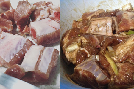 再继续翻炒几下后放入老抽调色。然后放盐,蒜末和倒入料酒迅速盖锅焖一下。试味之后再调整味道,加入葱,就可以装盘了。香气喷鼻,排骨鲜嫩入味。