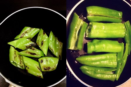 将准备好的尖椒洗好后切段,记得要去掉里边的籽和茎。然后在锅底刷一层油。虎皮尖椒重要的是要把尖椒做好,做出如虎皮一样的颜色,但是不能有焦味,所以火候千万要把握好。把之前洗好的尖椒段放入油锅中用火煎,煎的时候记得用锅铲把尖椒多按几下,按的扁一点,可以多翻几次,确保两面的受热均匀,都可以煎出虎皮的颜色。
