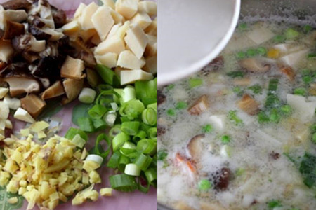 食材:鸡肉100克、大虾100克、嫩豆腐250克、冬笋100克、玉米粒、鸡蛋1个、豌豆、小葱、大蒜、姜、干花蛤、干贝、香菇、水淀粉、盐、油。