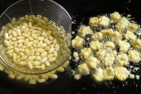 炒锅内倒入适量食用油,花生仁冷油下锅,炸至金黄酥脆,捞出控油。将锅里的油热至七成,下豆腐块炸制,豆腐炸成焦黄色捞出控油。