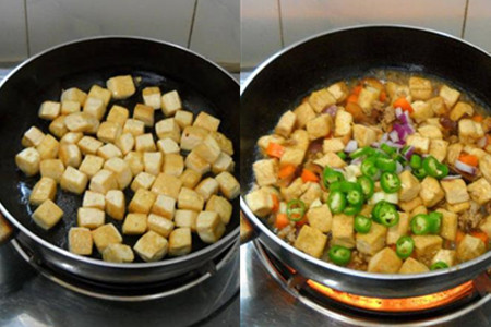 炒锅内注入适量油,烧热,下豆腐块煎制,豆腐块煎成两面酥黄,盛出锅待用。