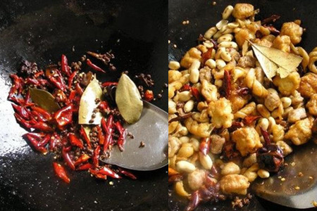 将油锅的油倒出大部分,留少许在锅里,放入花椒、大茴、香叶、麻椒和干辣椒爆香,倒入炸好的花生仁翻炒,接着放入炸好的猪肉丁和豆腐块,翻炒均匀,再把麻花掰成小段放入锅里,调入少许食盐,炒匀即可出锅。