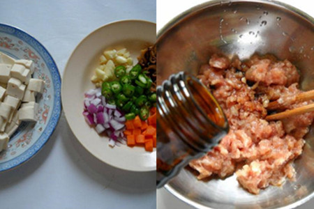 豆腐切成小方块。香菇泡发好,洗净切成小丁,胡萝卜洗干净切成小丁,洋葱洗干净切成丁,大蒜去皮切成末,青椒洗干净切段。猪腿肉洗干净剁成末,装入碗里,加入适量老生抽、料酒和花椒水,搅拌至出现黏性,腌制片刻。