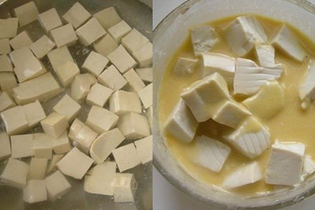 豆腐切成小方块。锅里倒入适量清水,开火煮开,放入豆腐块烫一下,捞出锅滤干水分待用。准备一个小碗,加鸡蛋液、淀粉和食盐,搅拌均匀调成面糊。把开水烫过的豆腐块放入面糊里,让豆腐均匀地裹上面糊待用。