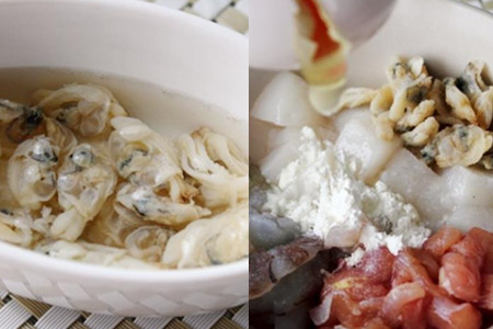 干花蛤用温水泡十分钟,清洗干净待用。鸡肉洗净切成丁,干贝洗净切成丁,大虾去壳去虾线。将鸡肉丁、大虾、干贝丁和花蛤一起装入碗里,加适量食盐、淀粉和鸡蛋清,搅拌均匀待用。