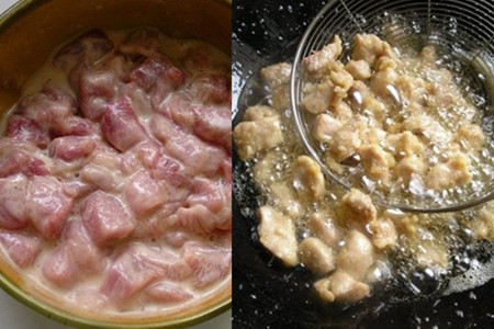 猪腿肉洗干净切成小丁,加适量鸡蛋面糊,搅拌均匀,也放入油锅里炸制,肉丁炸成金黄色捞出控油。